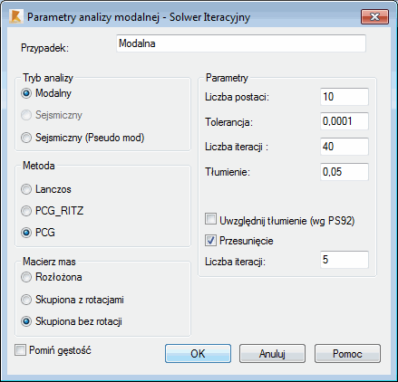 W obecnej wersji dla solwera iteracyjnego dostępne są tryby: modalny i sejsmiczny (pseudomodalny). Tryb modalny dostępny jest tylko dla metody gradientu sprzężonego z zastosowaniem ‘preconditioning’ (preconditioned conjugate gradient method — PCG) [1—4]; tryb sejsmiczny (pseudomodalny) dostępny jest zarówno dla zmodifikowanej metody Lanczosa i metody gradientów Ritza (PCG_Ritz — Ritz—gradient method).