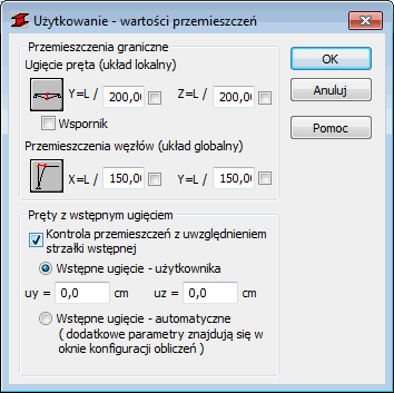 Opcja służy do definiowania dodatkowych parametrów normowych określających wartości przemieszczeń (przemieszczenia graniczne). Opcja jest dostępna po naciśnięciu przycisku Użytkowanie znajdującego się w oknie dialogowym Definicja pręta — parametry. Na ekranie pojawia się okno dialogowe pokazane na poniższym rysunku.