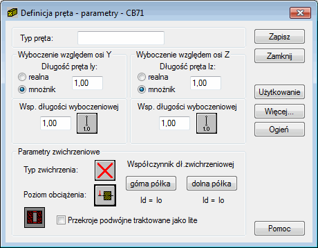 W polu Parametry zwichrzeniowe wybrane mogą zostać opcje wykorzystywane podczas weryfikacji zwichrzenia pręta: typ zwichrzenia, poziom obciążenia i współczynnik długości zwichrzeniowej.