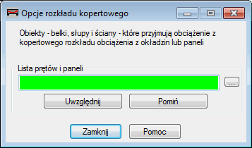 Istnieje możliwość wybrania obiektów, które leżą w płaszczyźnie okładziny (lub panelu z wybranym rozkładem kopertowym w modelu obliczeniowym), a nie będą przenosić obciążenia. W rzeczywistej konstrukcji mogą to być np. elementy stężenia dachowego, które nie przenoszą obciążenia przekazywanego przez pokrycie. Obiekty mogą być wybrane na dwa sposoby: