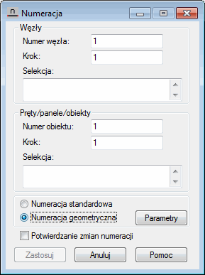 Opcja służy do definiowania przez użytkownika numeracji węzłów, prętów, paneli i obiektów. Opcja dostępna po wybraniu: