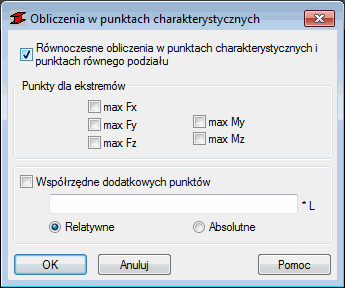 Jeżeli zaznaczona jest opcja Równoczesne obliczenia w punktach charakterystycznych i punktach równego podziału, to obliczenia prętów konstrukcji zostaną przeprowadzone dla zdefiniowanych punktów charakterystycznych (określonych w tym oknie dialogowym), jak i dla liczby punktów obliczeniowych określonych w oknie dialogowym Konfiguracja (opcja Liczba punktów).