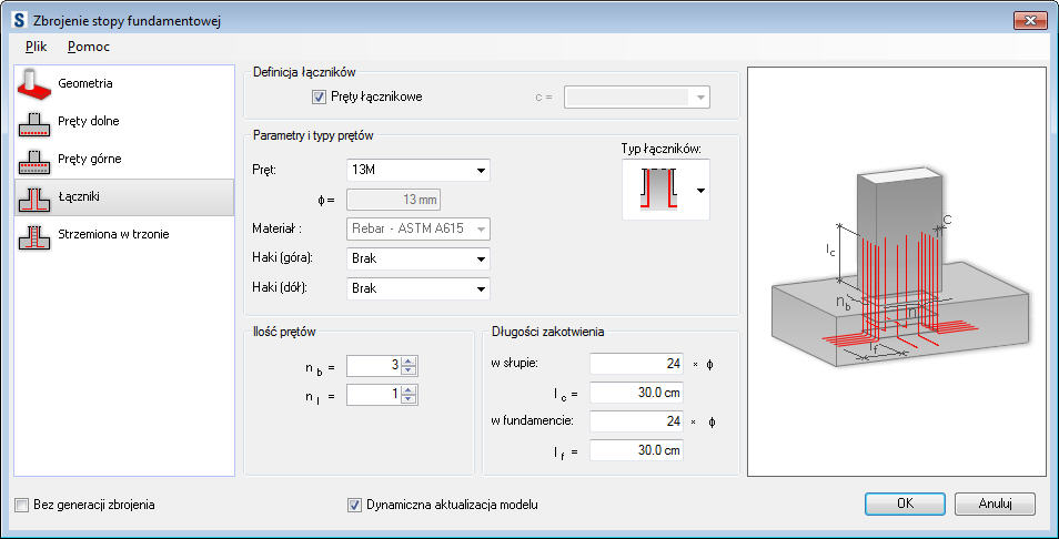 Aby wygenerować zbrojenie łącznikowe w stopie fundamentowej, w polu Definicja łącznika należy wybrać pozycję Łączniki. Następnie można zdefiniować parametry zbrojenia łącznikowego: