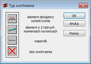 Opcja służy do określenia odpowiednich, normowych parametrów zwichrzeniowych w zależności od schematu statycznego pręta. Jest dostępna po naciśnięciu odpowiedniej ikony znajdującej się w polu Parametry zwichrzeniowe znajdującego się w oknie dialogowym Definicja pręta — parametry.
