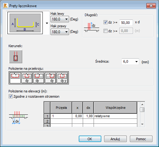 - długość prętów łącznikowych; długość może być określona na dwa sposoby: poprzez podanie odległości lub poprzez podanie mnożnika średnicy pręta zbrojeniowego