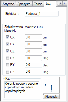 Definiowanie podpory z odstępem polega na wskazaniu nazwy podpory, wybraniu stałych lub zwolnionych stopni swobody i wskazaniu wartości dopuszczalnych przemieszczenia lub obrotu w kierunkach swobodnych. Jeśli kierunek jest stały, przemieszczenie jest równe zero.