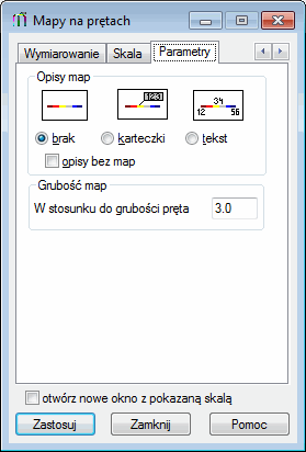 - opisy bez map — jeżeli ta opcja zostanie włączona, to dla prętów konstrukcji będą prezentowane jedynie opisy (w postaci karteczek lub tekstu na prętach) bez map wybranej wielkości