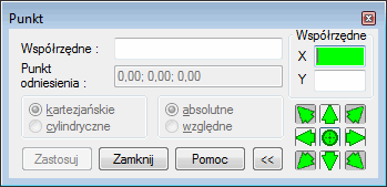 Okno dialogowe umożliwia zdefiniowanie punktu w odniesieniu do wybranego punktu odniesienia lub w sposób absolutny. Współrzędne punktu mogą być określane we współrzędnych kartezjańskich lub cylindrycznych. Opcja może być używana podczas definiowania współrzędnych węzłów, prętów, konturów i innych obiektów. W polu Punkt odniesienia wyświetlane są współrzędne ostatnio definiowanego punktu. Jeżeli punkt odniesienia ma być konkretnym punktem istniejącej już części modelu, to można na przykład zdefiniować (zredefiniować) węzeł w tym punkcie.