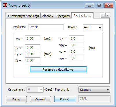 Karta Ax, Iy, Iz służy do definiowania przekroju w oknie dialogowym Nowy przekrój poprzez podanie właściwości geometrycznych przekroju.