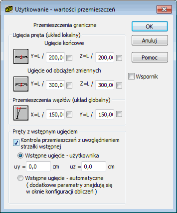 Zdefiniowane mogą zostać graniczne przemieszczenia (ugięcia pręta w kierunku X i Y oraz ugięcia wypadkowego yz, przemieszczenia węzłów w kierunku X i Y) oraz dodatkowo przy określaniu granicznych ugięć pręta określone może zostać, czy pręt jest wspornikiem.