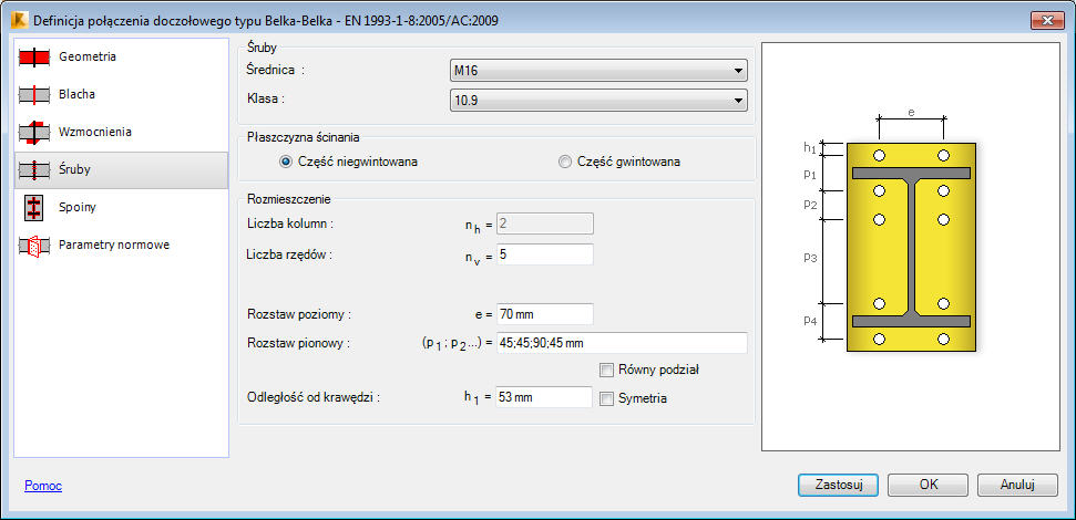 Opcje znajdujące się na zakładce Śruby pozwalają na zdefiniowanie średnicy i klasy śrub używanych w połączeniu oraz na rozmieszczenie śrub w stosunku do krawędzi blachy czołowej.
