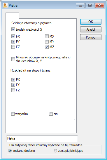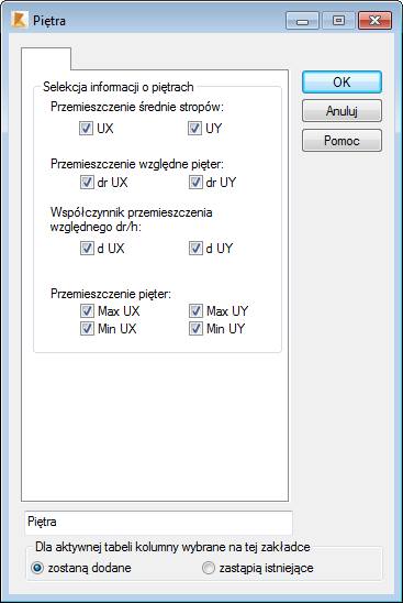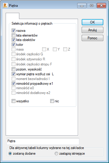 W oknie dialogowym Piętra można wybrać, które z tych właściwości lub wyników są wyświetlane w tabeli Piętra.