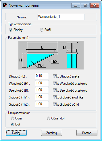 Tak wprowadzone wzmocnienie zostaje zapisane pod ustaloną przez użytkownika nazwą. Może być ono potem wielokrotnie używane w konstrukcji. Wzmocnienia dla danego pręta wprowadza się osobno dla każdego z końców pręta.