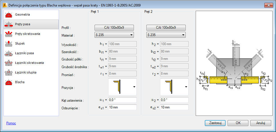 Na zakładce Pręty pasa znajdują się opcje pozwalające na zdefiniowanie podstawowych parametrów prętów pasa dochodzących do blachy węzłowej: