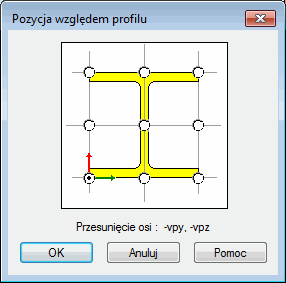 W powyższym oknie dialogowym określone może zostać odsunięcie osi podłużnej pręta w stosunku do wymiarów poprzecznych przekroju. Wybór położenia osi następuje poprzez kliknięcie w odpowiedni przycisk wyboru znajdujący się na szkicu przekroju. Pod szkicem przekroju pręta pojawia się opis położenia przekroju pręta, tzn. przesunięcie osi oraz charakterystyka położenia przekroju opisująca wartość przesunięcia osi w lokalnym układzie współrzędnych.