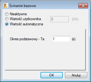 Użyj tego okna dialogowego, aby uwzględnić siły ścinania podstawy: oblicz wartość tej siły zgodnie z przewidywaniami normy sejsmicznej (opcja Wartość automatyczna ) lub podaj ją (opcja Wartość użytkownika).