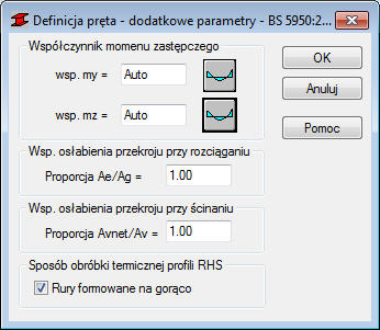 Opcja ta jest używana do definiowania dodatkowych parametrów normowych typu elementów stalowych dla brytyjskiej normy BS 5950:2000. Staje się dostępna po naciśnięciu przycisku Więcej, znajdującego się w oknie dialogowym Definicja pręta — parametry.