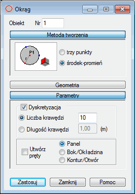 Opcja Utwórz pręty dostępna jedynie przy włączonej opcji Dyskretyzacja. Jeżeli opcja jest włączona, to definiowany okrąg będzie składał się z elementów prętowych (poszczególne części okręgu będą prętami).