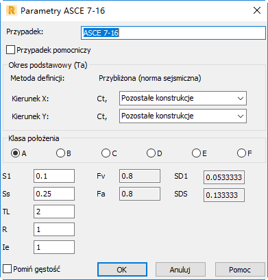 Parametry uproszczonej analizy sejsmicznej z wykorzystaniem metody zastępczej siły poziomej zależą od normy sejsmicznej oraz metody definiowania wartości okresów podstawowych wybranych w oknie dialogowym Analiza sejsmiczna.