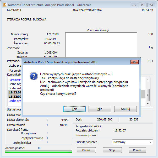 Jeśli jest wybrana analiza modalna i procent mas danej maksymalnej liczby węzłów jest mniejszy niż jest to wymagane, zostanie wyświetlone ostrzeżenie o nieodpowiednim procencie mas i obliczenia będą kontynuowane bez żadnych poprawek.