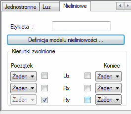 Uwaga: Model nieliniowości zawiera informacje o stopniu swobody (przemieszczenie lub obrót). Modele są więc filtrowane to znaczy model nieliniowości z ustawionym typem przemieszczenie—siła nie jest widoczny w listach wyboru dla RX, RY, RZ.