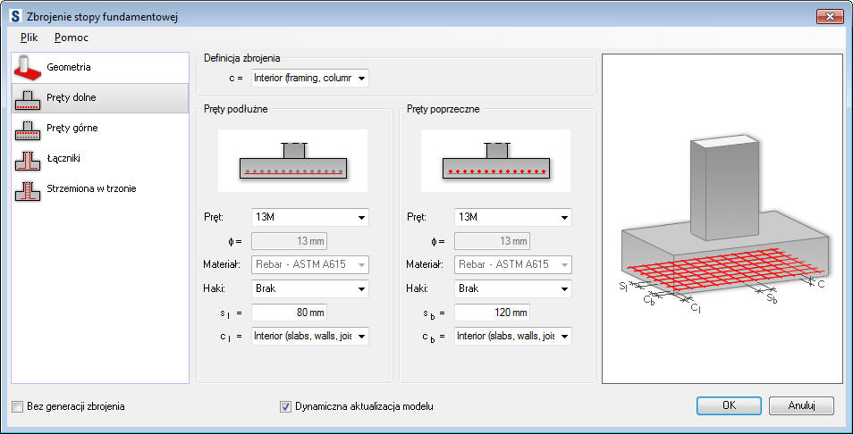 W oknie dialogowym Zbrojenie stopy fundamentowej można zdefiniować parametry zbrojenia dolnego: