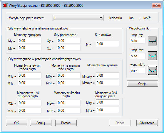 Okno dialogowe Weryfikacja ręczna służy do weryfikacji pręta stalowego względem wartości sił zdefiniowanych przez użytkownika, zgodnie z wymaganiami brytyjskiej normy stalowej BS5950:2000. Po wybraniu polecenia: Projekt