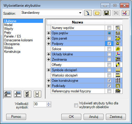 Opcja Widoczność atrybutów pozwala na wybór atrybutów konstrukcji, które mają być wyświetlane na ekranie. W oknie dialogowym jest wyświetlana tylko, jeśli.NET komponent jest zainstalowany.