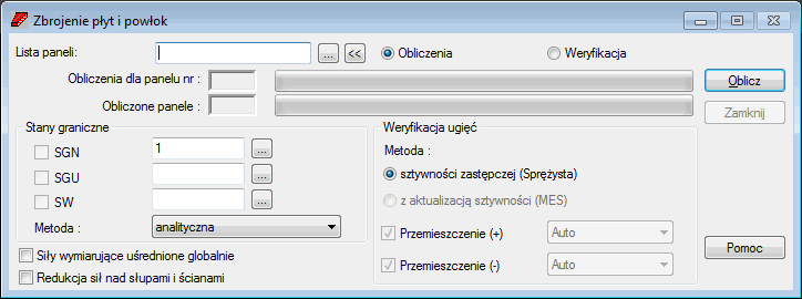 - Obliczenia paneli przeprowadzane są wyłącznie dla paneli, których numery wpisane zostały w polu edycyjnym Lista paneli oraz dla przypadków lub kombinacji przypadków określonych w polach edycyjnych ULS, SLS, ACC.