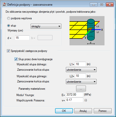 Włączenie opcji Sprężystość zastępcza podpory pozwala na obliczenie zastępczej sprężystości podpór na podstawie charakterystyk i geometrii słupów (w przypadku podpór węzłowych) lub ścian (w przypadku podpór liniowych).
