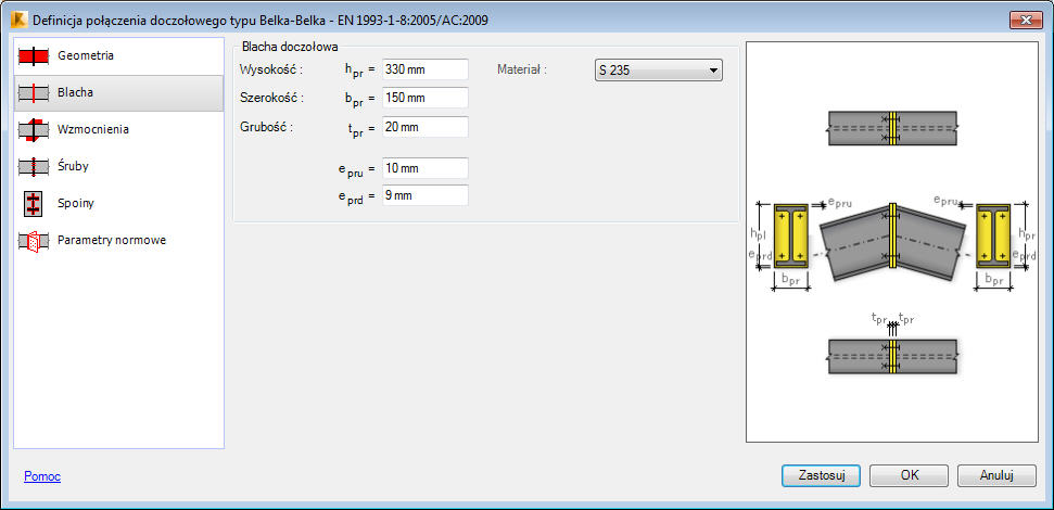 W zakładce Blacha określić można parametry blachy doczołowej.