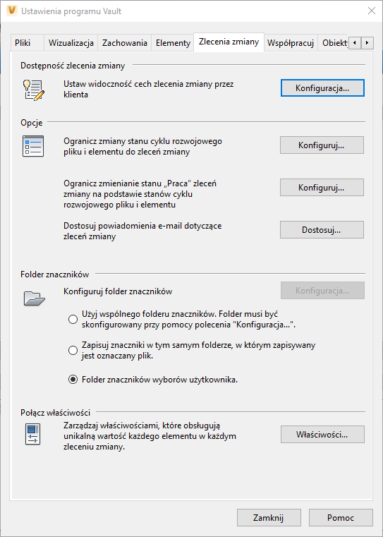 Zachowanie zlecenia zmiany można skonfigurować na karcie Zlecenia zmiany w oknie dialogowym Ustawienia programu Vault.