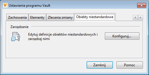Administratorzy mogą tworzyć, edytować i usuwać definicje obiektów niestandardowych. Dostęp do ustawień administracyjnych obiektów niestandardowych można uzyskać, klikając przycisk Konfiguruj na karcie Obiekty niestandardowe w oknie dialogowym Ustawienia programu Vault.