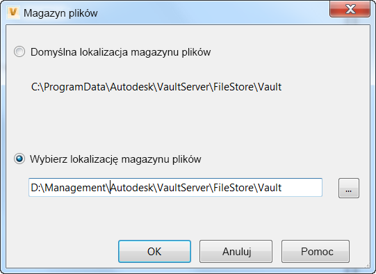 Uwaga: Lokalizacja ta może być lokalna lub sieciowa. Jeśli chcesz określić lokalizację na innym komputerze, użyj konwencji nazywania ścieżek UNC. Na przykład: \\SERWER\UDZIAŁ\Vault.