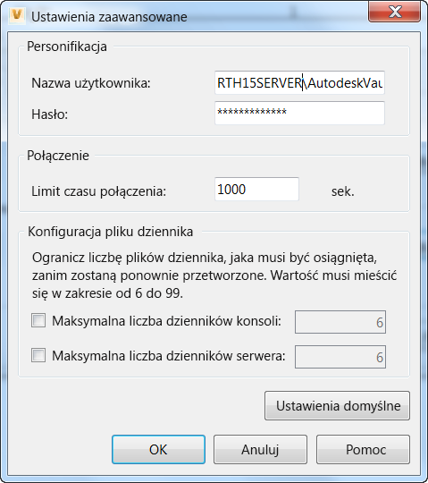 W oknie dialogowym Ustawienia zaawansowane w programie Autodesk Vault File Server Console można skonfigurować ustawienia konta personifikacji, próg limitu czasu oraz liczbę przechowywanych dzienników konsoli i serwera.