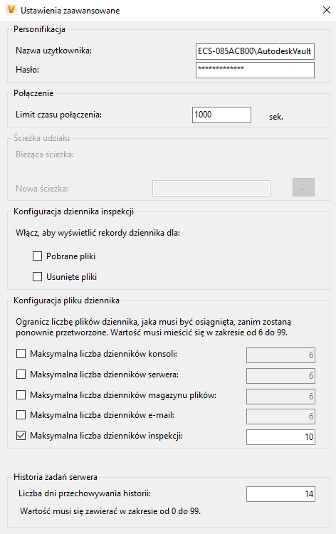 Można skonfigurować liczbę dzienników konsoli, serwera i poczty e-mail zachowywanych na serwerze Vault.