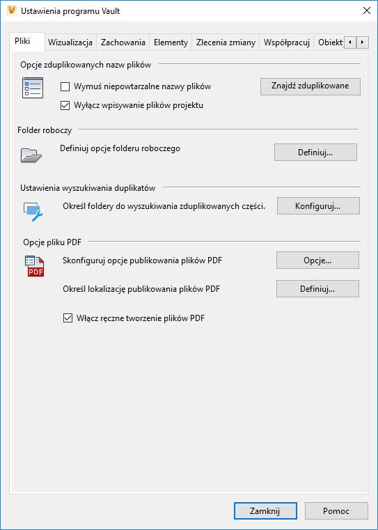 Karta Pliki w oknie dialogowym Ustawienia programu Vault zawiera opcje umożliwiające wymuszanie niepowtarzalnych nazw plików, wyłączanie wpisywania plików projektu, określanie opcji folderu roboczego i wyszukiwanie duplikatów.