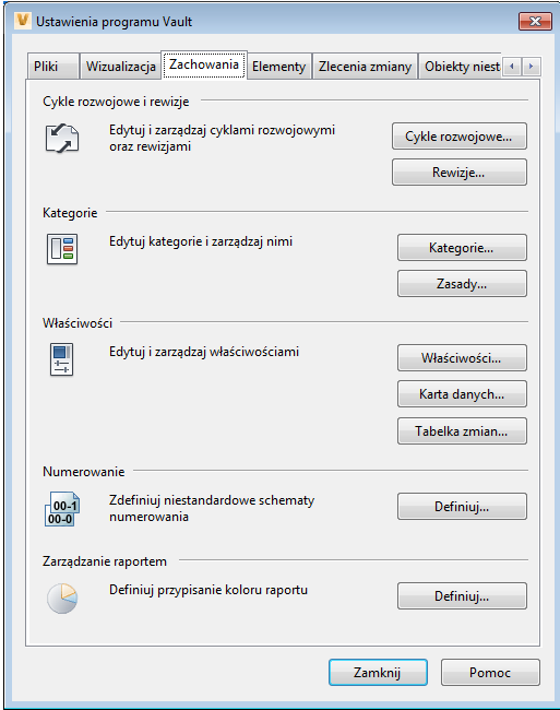 Karta Zachowania w oknie dialogowym Ustawienia programu Vault zawiera opcje umożliwiające edytowanie definicji cyklu rozwojowego i zarządzanie zmianami, administrowanie kategoriami i regułami, tworzenie i modyfikowanie właściwości, definiowanie niestandardowych schematów numerowania oraz przypisywanie kolorów w raportach.
