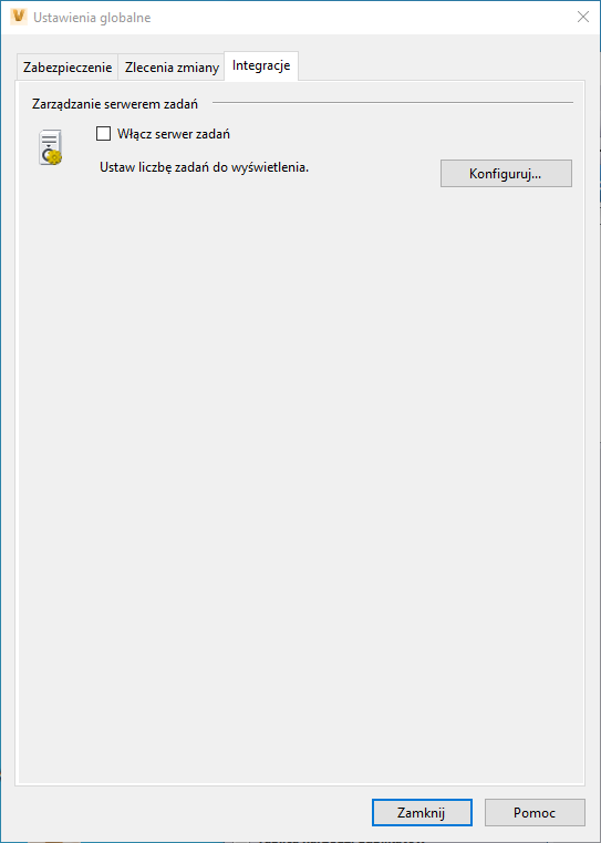 Na karcie Integracje w oknie dialogowym Ustawienia globalne można włączyć serwer zadań i skonfigurować ustawienia publikowania w katalogach programu SharePoint.