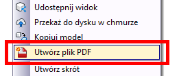 Kliknij prawym przyciskiem myszy i wybierz opcję Utwórz plik PDF. Możesz też wybrać polecenie z menu Operacje. WAŻNE: Polecenie Utwórz plik PDF jest dostępne tylko dla najnowszej wersji pliku, a nie dla historycznych wersji/zmian plików CAD 2D.