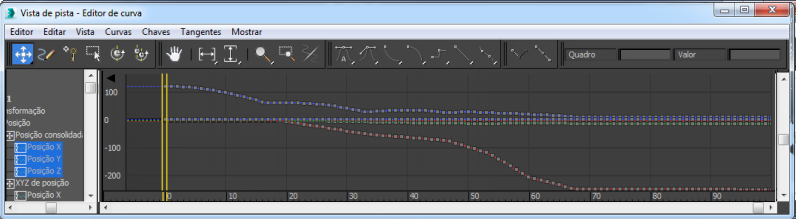 Track View se abre no modo Curve Editor. Somente tracks animadas do objeto selecionado são realçados na janela Hierarquia em Track View - Curve Editor. Este é o comportamento padrão.