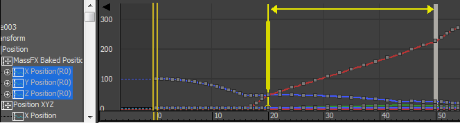 Agora é possível visualizar somente as teclas e curvas da track destacada, cujos nomes mudam para Posição X (R1) e Rotação Y (R1). Isto indica que as tracks estão sob o controle de Retimer 1.