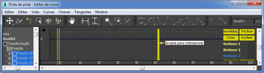 Para usar a ferramenta Retime, abra Track View no modo Curve Editor e selecione as tracks nas quais deseja realizar a variação de tempo. A seguir, após ativar a ferramenta, clique duas vezes na janela Editor de Curva em Track View para posicionar os marcadores do retime. Cada par de marcadores verticais adjacentes incluem o tempo entre eles nas tracks selecionadas. Em seguida, mova os marcadores para alterar o tempo da animação. Se você aproximá-los, a animação acelera; se distanciá-los, a animação desacelera.