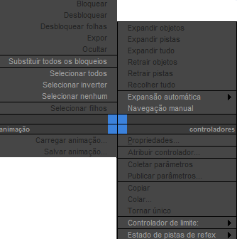 Fornece acesso rápido aos comandos para trabalhar com controladores, bloqueando e desbloqueando trilhas para usar com containers, navegando na lista Hierarquia da janela Controlador, carregando e salvando arquivos de animação e mais.