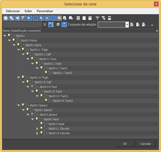 A caixa de diálogo é modal, portanto não há a sincronização automática entre itens realçados na lista e a seleção dos objetos correspondentes na cena. Para fazer uma seleção, use inicialmente a caixa de diálogo para realçar os objetos a serem selecionados e clique em OK para fechar a caixa de diálogo e selecionar os objetos.