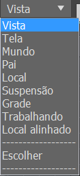 A lista Sistema de Coordenadas de Referência permite que você especifique o sistema usado para uma transformação (Move: Mover, Rotate: Rotacionar e Scale: Redimensionar). As opções incluem View (Ver), Screen (Tela), World (Mundo)Parent (Pai)Local, Gimbal (Articulação Cardan), Grid (Grade) Working (Atuante) e Pick (Selecionar).