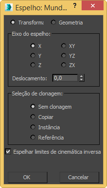 A ferramenta Espelho também permite espelhar a seleção atual sobre o centro do sistema de coordenadas atual. Simultaneamente, é possível criar um clone da caixa de diálogo Espelho. Se espelhar um vínculo hierárquico, você terá a opção de espelhar os limites de cinemática inversa.