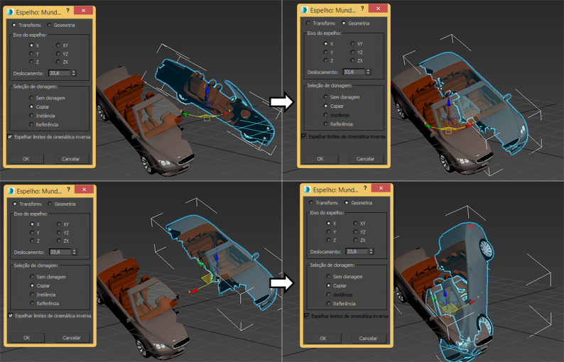 Na ilustração a seguir, primeiro o carro é espelhado, clonado e deslocado no sistema de coordenadas universal com a opção de transformação (superior esquerdo) e a opção de geometria (superior direito). A metade inferior da ilustração descreve o mesmo processo usando o sistema de coordenadas local.