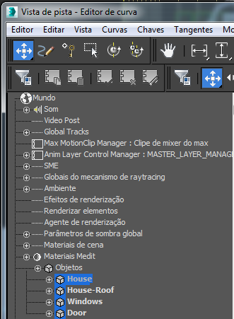 A Vista de trilha fornece métodos sofisticados para edição de suas trilhas de animação. Além disso, sua lista de hierarquia exibe todos os objetos na cena por nome e hierarquia. Usando a Vista de trilha, é possível selecionar qualquer objeto na cena, clicando no seu ícone de objeto na lista de hierarquia.