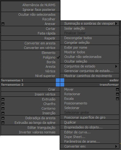 Menus quadrados adicionais especializados se tornam disponíveis quando você trabalha no ActiveShade, na caixa de diálogo Editar UVWs ou ao pressionar qualquer combinação das teclas Shift, Ctrl ou Alt enquanto clica com o botão direito em qualquer viewport padrão.